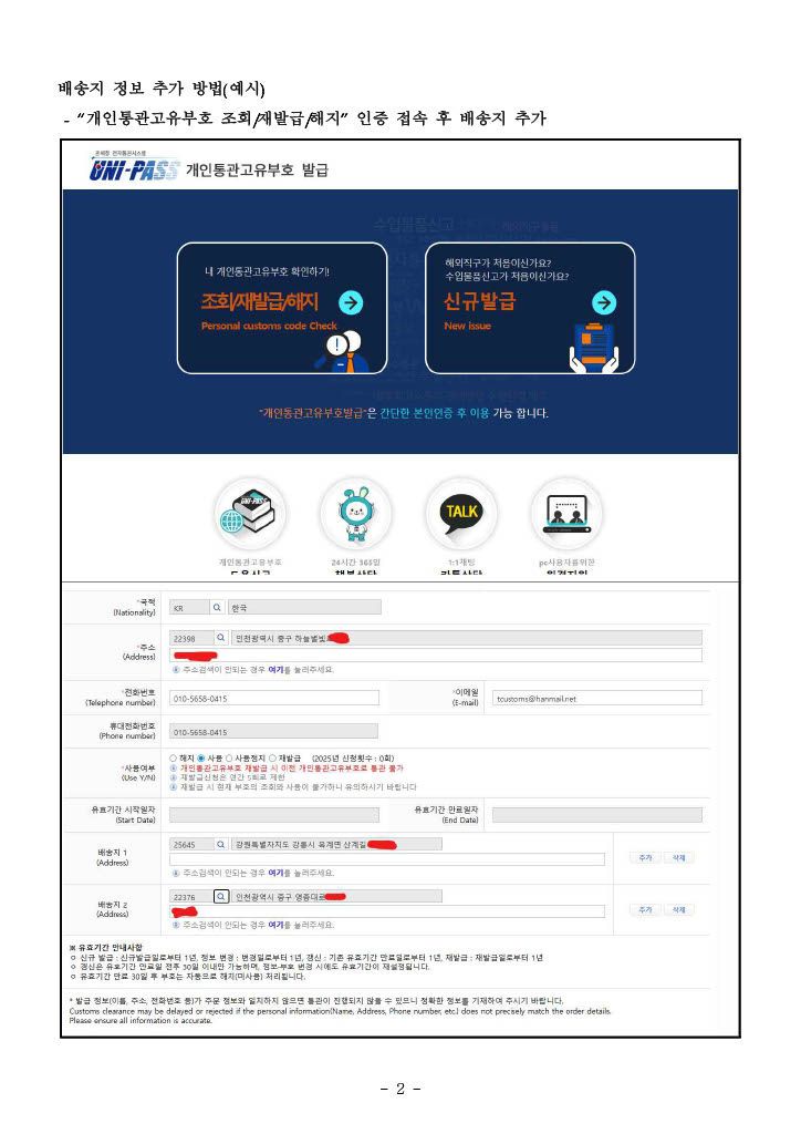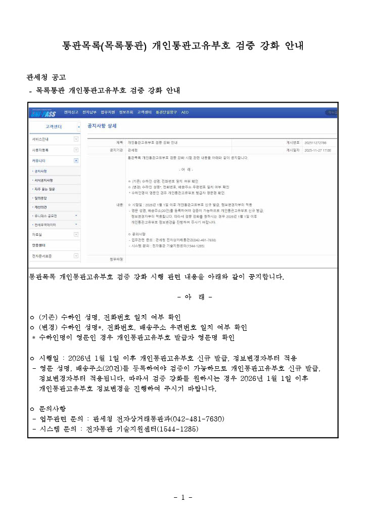 ¾È³çÇϼ¼¿ä. ½Ã¾Ë·ÎÁöÅØ ÀÔ´Ï´Ù. °ü¼¼Ã»ÀÇ °³ÀÎÅë°ü°íÀ¯ºÎÈ£ °ËÁõ °È(2026³â ½ÃÇà) °ü·Ã ¾È³»µå¸³´Ï´Ù. 📌 Àû¿ë ´ë»ó 2026.01.01 ÀÌÈÄ °³ÀÎÅë°ü°íÀ¯ºÎÈ£ ½Å±Ô ¹ß±ÞÀÚ ¹× Á¤º¸º¯°æÀÚ 📌 º¯°æ»çÇ×(°ËÁõ °È) ±âÁ¸ : ¼º¸í, ÀüȹøÈ£ º¯°æ : ¼º¸í + ÀüȹøÈ£ + ¹è¼ÛÁö ¿ìÆí¹øÈ£ È®ÀÎ ¡Ø ¼öÇÏÀÎÀÌ ¿µ¹®¸íÀÎ °æ¿ì ¡æ °³ÀÎÅë°ü°íÀ¯ºÎÈ£ ¹ß±ÞÀÚ ¿µ¹®¸í°ú µ¿ÀÏÇØ¾ß ÇÔ ¿ìÆí¹øÈ£ °ËÁõ ½ÃÇàÀÏ : 2026.01.05 📌 Á¦µµ ÃëÁö ÀüÀÚ»ó°Å·¡ ¼öÀÔ Åë°üÇ÷§Æû(2026³â ÇϹݱ⠿¹Á¤)°ú ¿¬°è °³ÀÎÅë°ü°íÀ¯ºÎÈ£ 1³â ´ÜÀ§ °»½ÅÁ¦µµ¿Í ¿¬µ¿ 📌 °í°´»ç Áغñ»çÇ×(Áß¿ä) 2025.12.31±îÁö °³ÀÎÅë°ü°íÀ¯ºÎÈ£ ¹ß±Þ³»¿ª Á¶È¸ ȸ鿡¼ ½ÇÁ¦ ¹è¼ÛÁö ÁÖ¼Ò¸¦ Á¤È®È÷ µî·Ï °¡Á·¡¤ÁöÀÎ ÁÖ¼Ò·Î ¹è¼ÛÇÏ´Â °æ¿ì ¡æ ¹è¼ÛÁö 20°³ Çѵµ ³»¿¡¼ »çÀü Ãß°¡ µî·Ï ¡Ø ÷ºÎ : °ü¼¼Ã» ¾È³»¹® ¹× ¹è¼ÛÁö µî·Ï ȸéÀÚ·á ![]() ![]()